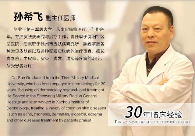 孙希飞主任1975年毕业于第三军医大学,毕业后,1976.3月-1988.1月 曾任职于沈阳军区总医院,1989-2012任职于徐州市皮肤病中医门诊部,至今,孙希飞主任从事皮肤病临床研究与诊疗工作已近30余年,具有丰富的临床经验和娴熟的医术技能,熟练掌握各种常见皮肤疾以及各种疑难皮肤病的诊断、治疗、 及愈后,对于皮肤病的治疗,孙希飞主任坚持中西医结合的治疗方式,长期以来始终坚持在医疗、教学工作第一线,受到了同行业患者的大力认可。